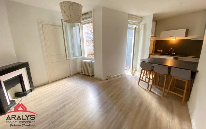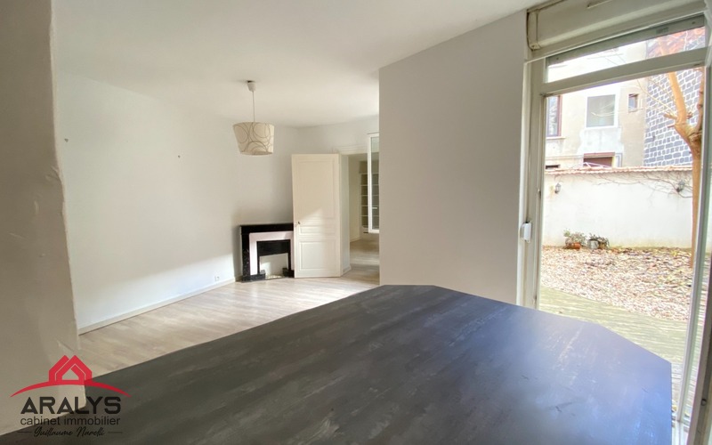 Roanne centre / Gare, bel appartement de 60m² en rez de jardin offrant une belle cuisine dinatoire ouverte sur salon, 2 chambres, salle de bain avec douche et baignoire, WC, terrasse clos de murs.