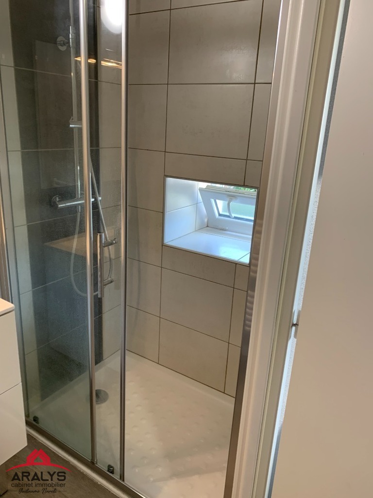 Une salle d’eau avec douche, meuble vasque + miroir et WC séparé