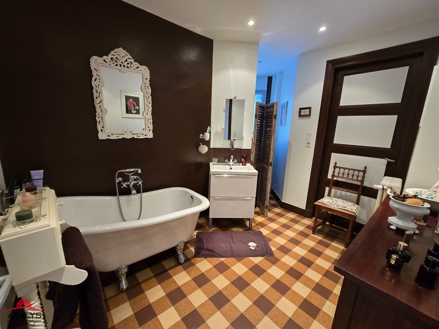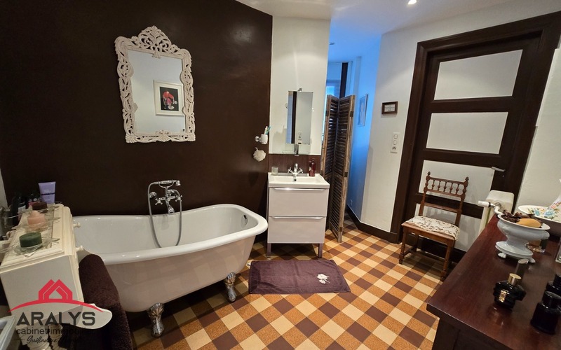 2 sanitaires : grande salle de bain familiale esprit rétro avec sa baignoire sur pied et salle d’eau avec douche italienne