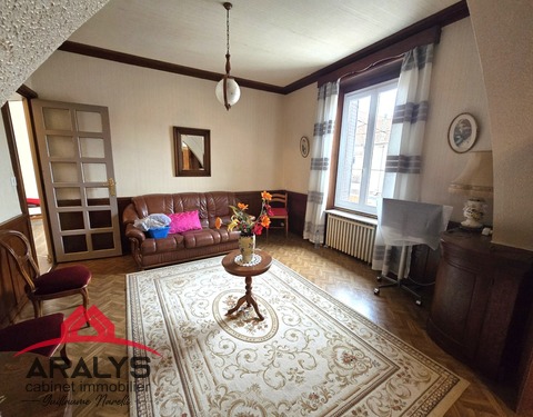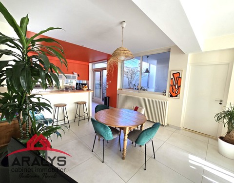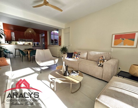 NOUVEAUTÉ chez ARALYS IMMOBILIER Maison avec une belle rénovation de 139 m² habitables. Offrant de plain-pied une cuisine équipée ouverte sur salon séjour de 52 m², un wc et un bureau ou une chambre pour la partie rez de chaussée. A l’étage trois chambres donnant sur un balcon une salle de bains et toilette. Pour compléter ce bien 170 m² de dépendances et trois caves. Un petit jardinet sur l’arrière de la maison. Les ++...