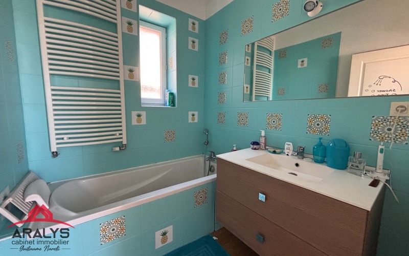 - Salle de bain avec baignoire, meuble vasque et rangements.