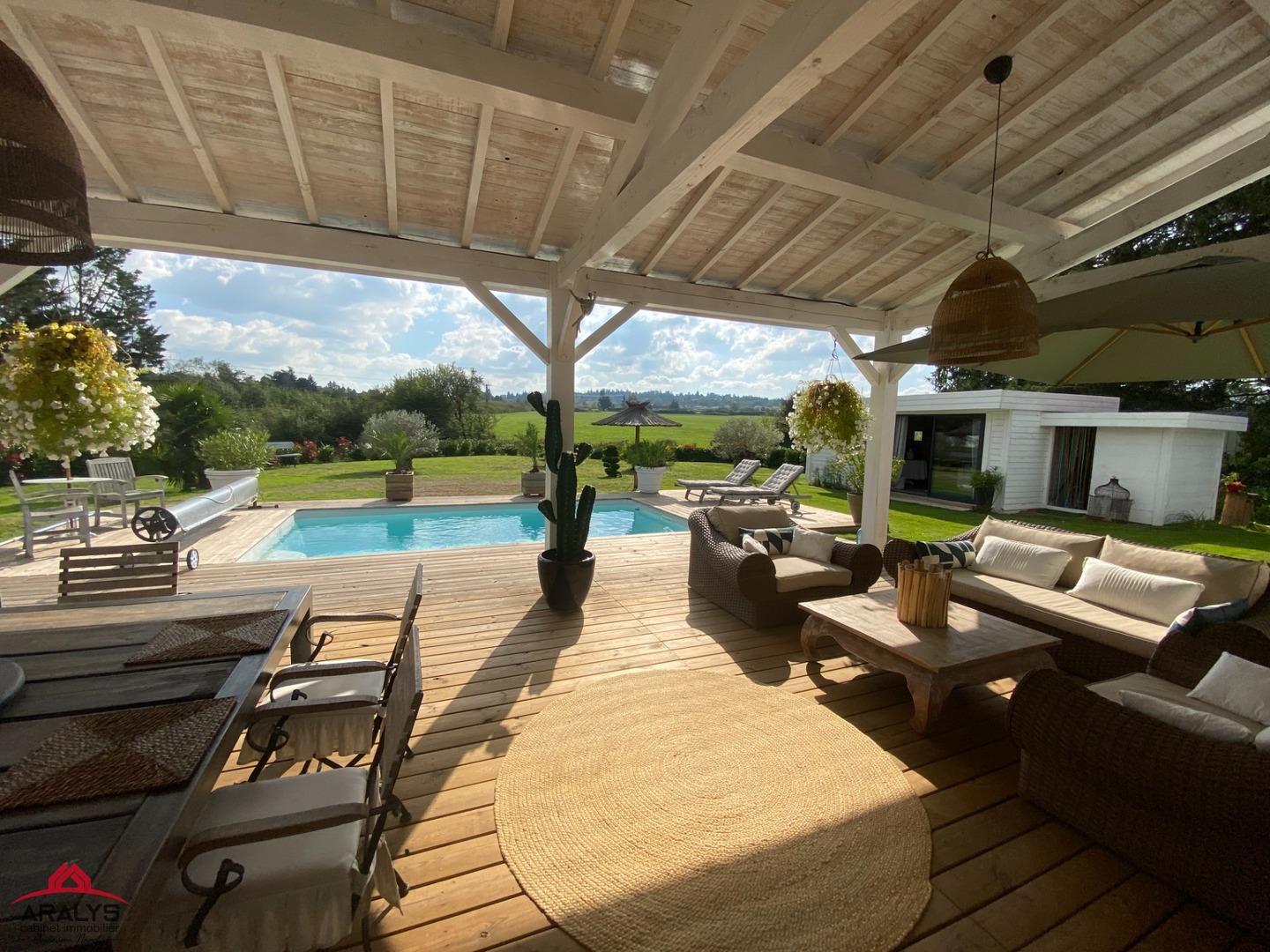 Une grande et magnifique terrasse avec vue dégagée sur la côte roannaise vous donne accès à la piscine sans aucun vis-à-vis ;